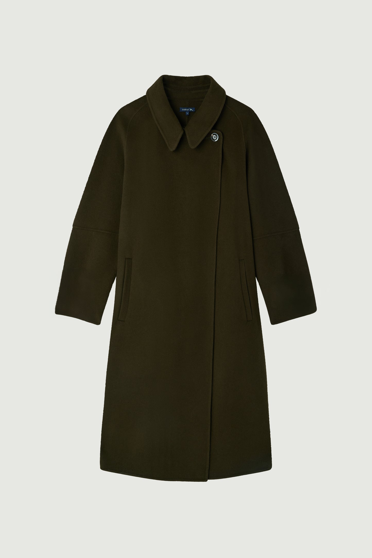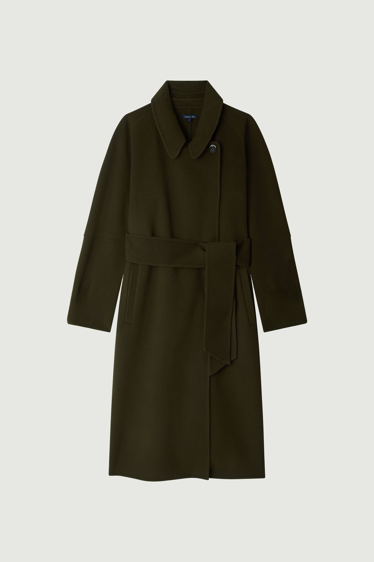 CHAMBERY is a long coat that gently follows the body's shape, crafted from double-faced wool in a deep khaki shade. It features a detachable collar with buttons and fastens with a removable belt for a perfect fit. In a minimalist spirit, the concealed seams highlight the sophisticated and timeless cut.